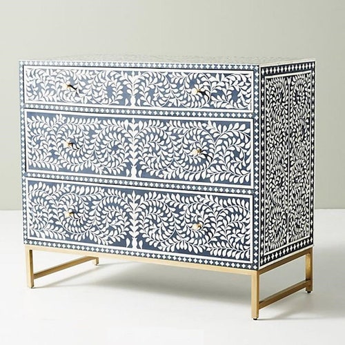 Bone Inlay Chest Of 3 Drawers Floral Design In Navy Blue With Etsy